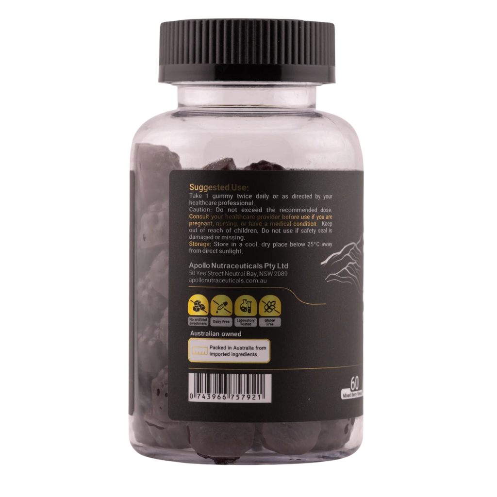 Himalayan Shilajit Resin – 250mg Other Ingredients:  Pectin (gelling agent), Citric Acid (330), Natural Flavours (Mixed Berry), Natural Colours (160a), Monk Fruit Extract (natural sweetener).
