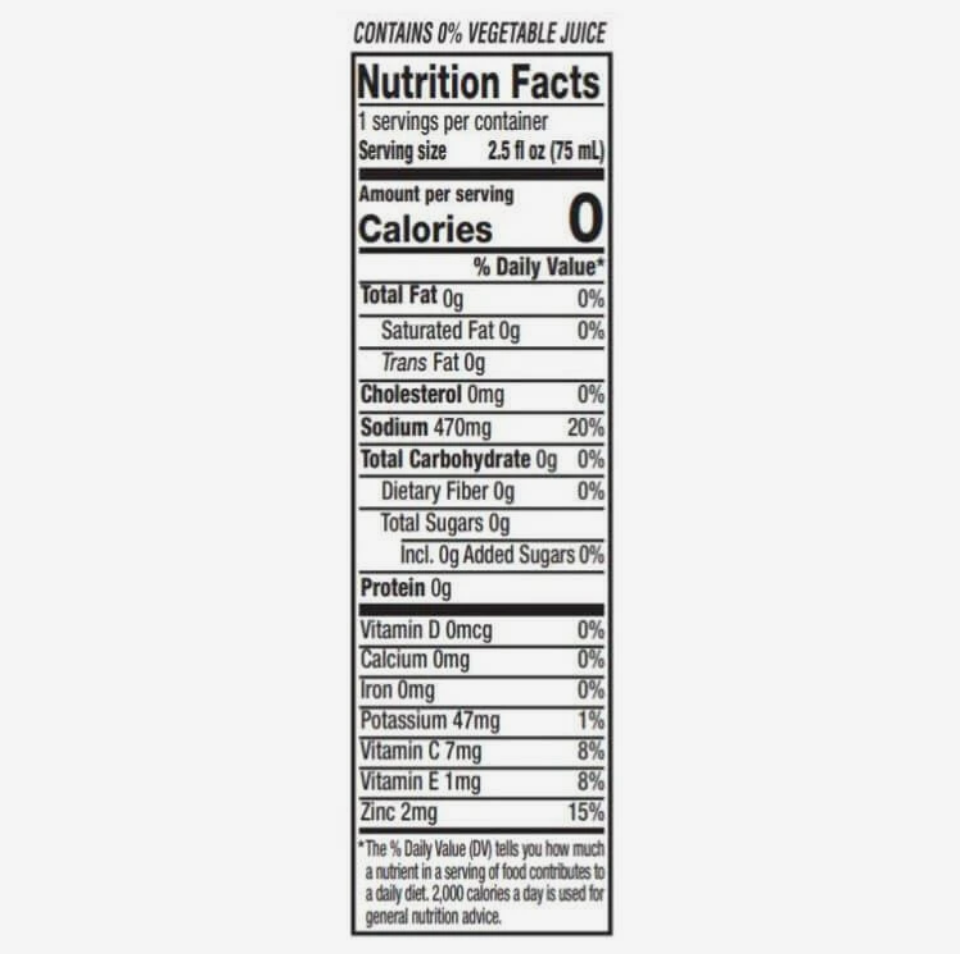 Serving size: 2.5 fl oz (75 mL) (1 bottle), servings per container: 1, Amount per serving: Calories: 0, Total Fat: 0g (0% DV), Cholesterol 0mg (0% DV), Sodium: 470 mg (20% DV), Potassium: 20mg (1% DV), Total Carbohydrate: 0g (0% DV), Sugars: 0g, Protein: 0g, Vitamin C (8% DV), Vitamin E (8% DV), Zinc: 2mg (13% DV). Percent daily values (DV) are based on a 2,000 calorie diet.