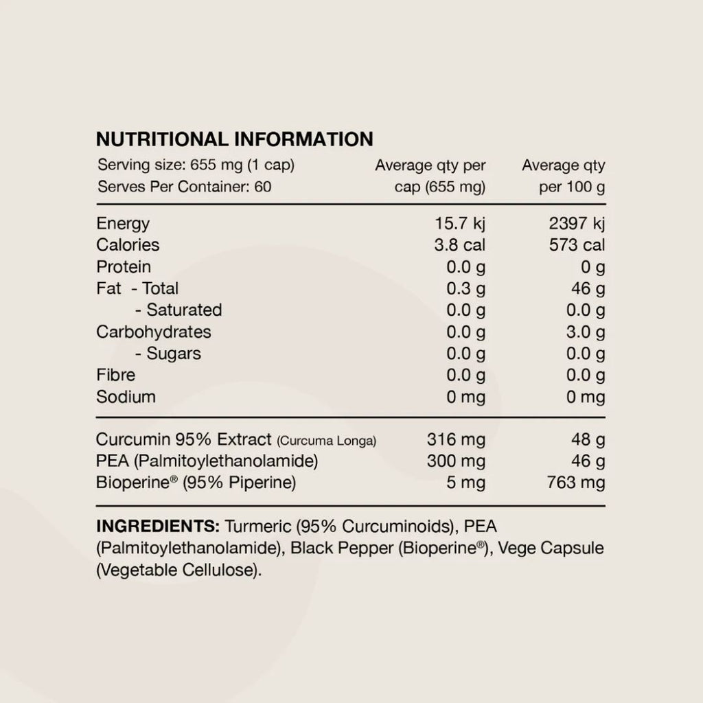 Turmeric (95% Curcuminoids), PEA (Palmitoylethanolamide), Black Pepper (Bioperine®), Vege Capsule (Vegetable Cellulose).