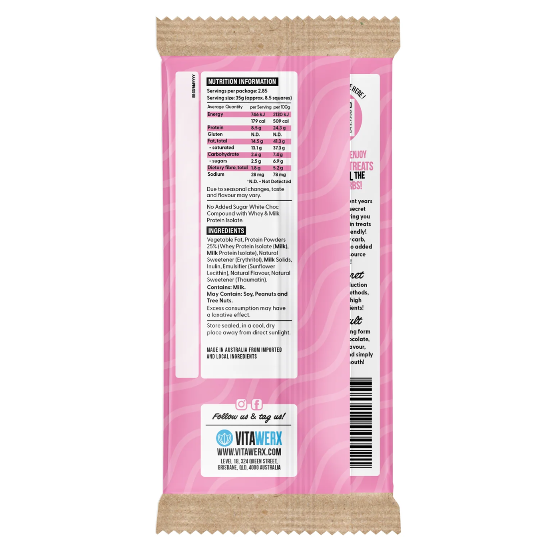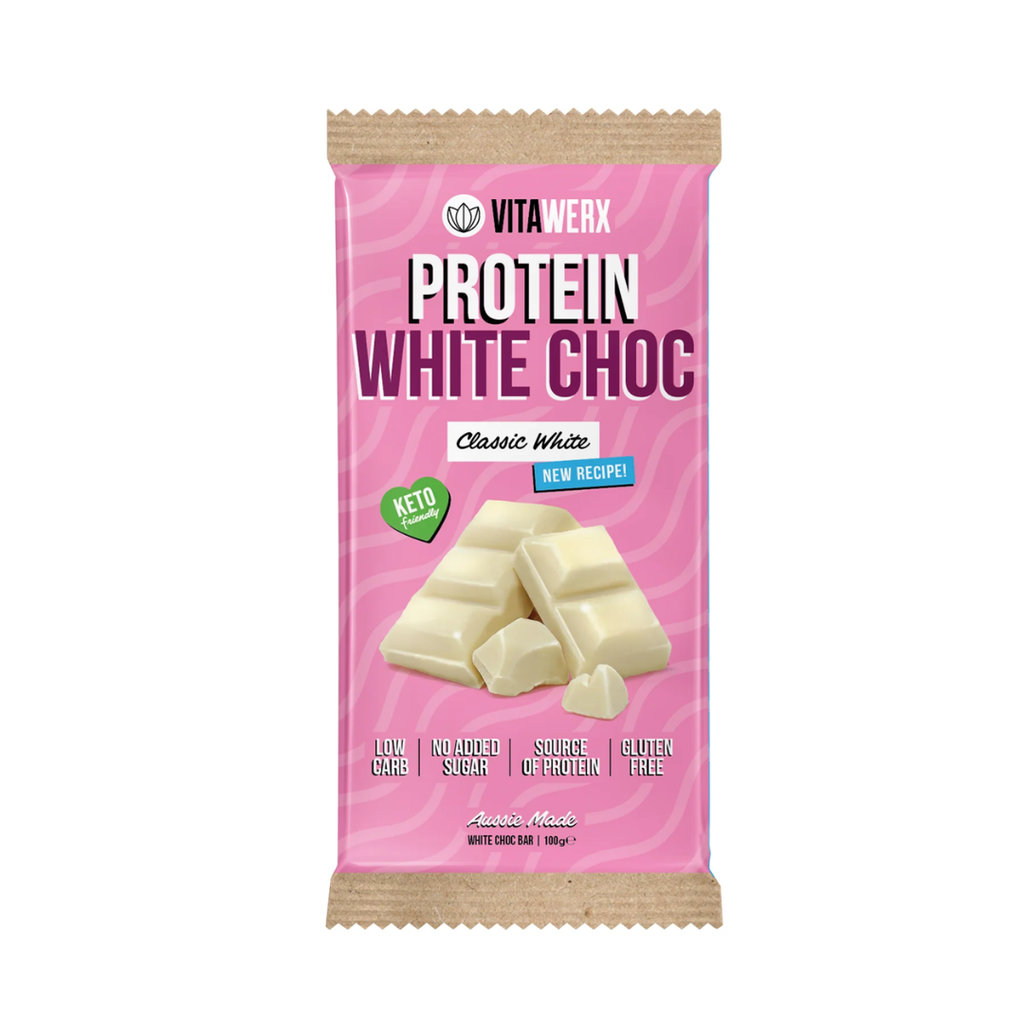 Indulge guilt-free with Vitawerx Protein White Choc, a deliciously creamy, high-protein chocolate crafted for those who value both taste and nutrition. Perfect as a post-workout treat or everyday snack, this gluten-free, low-carb chocolate delivers pure satisfaction without the added sugar.